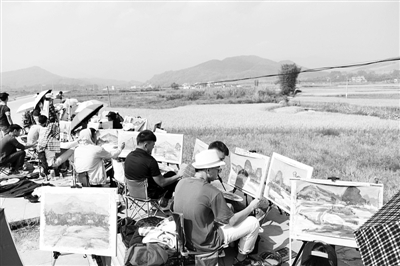 金秋时节,广西昭平县黄姚镇的晚稻开始成熟,绿色的山林、金色的田园与新农村相交辉映,如诗如画,美不胜收,吸引全国各地学生前来写生,描绘美丽画卷。图为10月19日,广东高州市师范学院的学生在黄姚镇黄姚街写生。刘飞摄