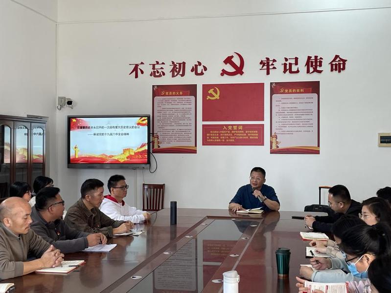 党支部组织委员梁天祥同志对党的十九届六中全会精神进行领学↑