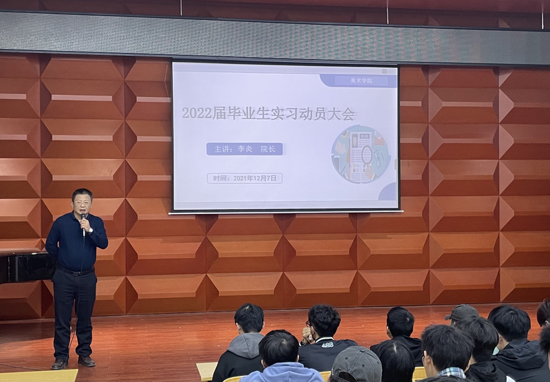 首先,美术学院李炎书记介绍了毕业生实习目的和任务,他希望师范生通过教育实践能够进一步认识对中小学的课程设置、专业学科教材的处理、课堂教学过程、班主任工作和学校行政管理;进一步了解中小学学生的心理特征;进一步牢固热爱教育工作、立志献身中小学教育事业的专业思想。非师范生通过实践活动,进一步加深对学科知识的理解,了解、掌握专业技能,增强学生职业道德观念。他从校内指导教师安排、备课试教验收、校外实习基本要求及提交实习材料等方面进行生动的具体阐释。随后,许建斌老师作实习动员,他从实习单位的选择、实习考核内容、实习鉴定及成绩评定进行了深入分析,要求同学们要按计划完成实习任务,按时向院办提交实习考核资料,并定期汇报实习情况。